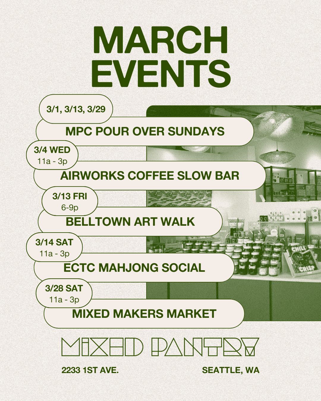 To close out their run, Side Quest Espresso is back on 3/1 serving up pour over flights. Come meet the roaster and explore coffee flavors with us.