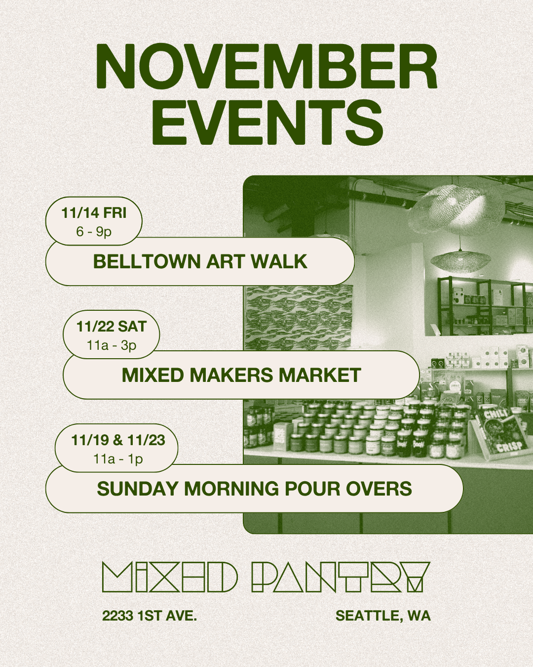 Drop by again for another fall market moment! Explore fuuuun flavors and creative print work at this Mixed Makers Market– start off with a smooth coffee or some Hong Kong-style Milk Tea and pair it with a sweet treat! There will be some samples for our not-so-sweet tooth folks, of course, too!