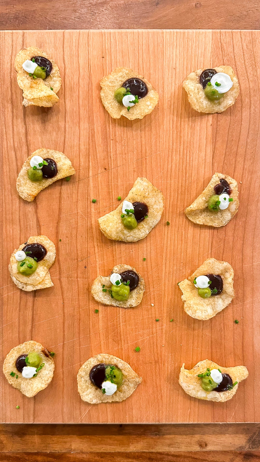 Chaat is a beloved Indian street food celebrated for its explosion of contrasting flavors and textures—sweet, sour, tangy, spicy, and crunchy—all in one irresistible bite. This version reimagines that iconic flavor experience as an elegant appetizer fit for a dinner party or festive gathering. The Black Salt Keya Chips create that signature lip-smacking base, while Brooklyn Delhi’s Tamarind Date Chutney adds sweet and sour depth. The cilantro-mint chutney brings vibrance and herbiness, and the sour cream ties it all together with cooling creaminess. A final sprinkle of chives lends a hint of fresh umami, making this chaat feel right at home on a party platter.