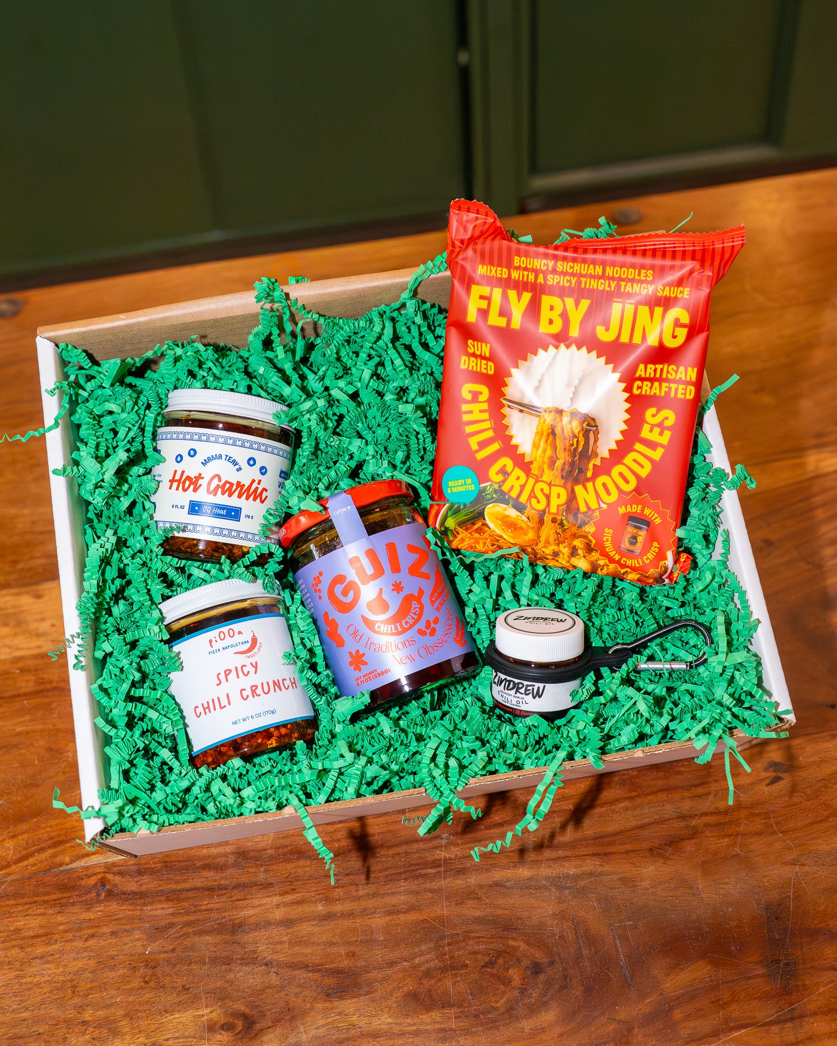 Includes: Mama Teav's Hot Garlic OG Heat, Guiz Chili Crisp with Fermented Black Beans, pi00a Spicy Chili Crunch, Fly By Jing Chili Crisp Noodles, Zindrew Chili Oil (OG) Key Chain -