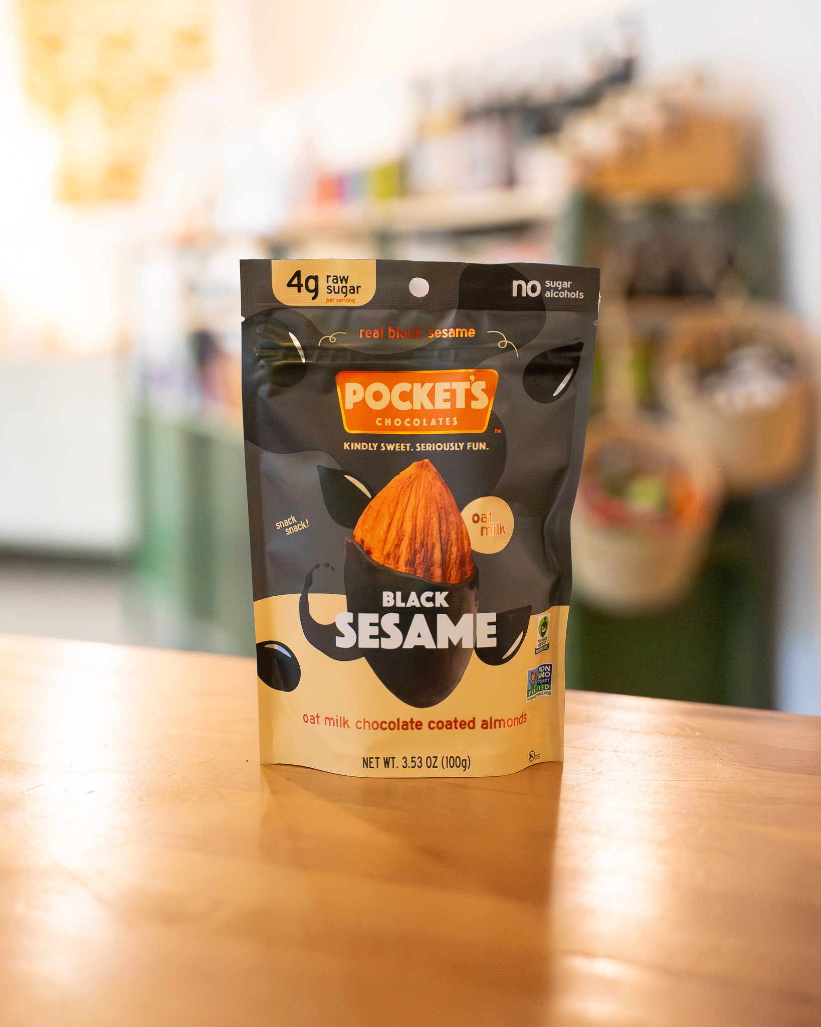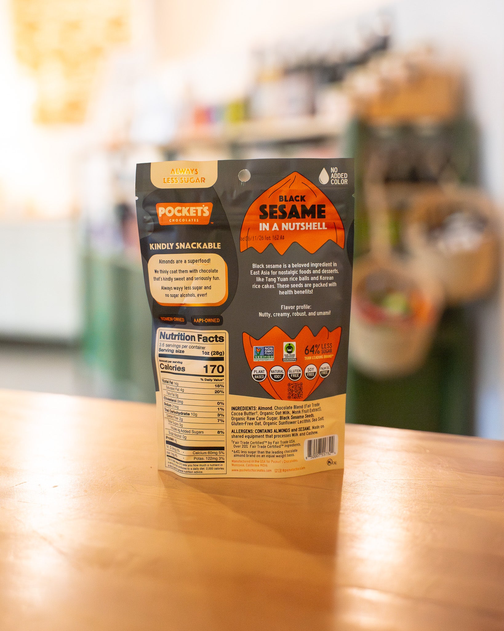 Indulge in Pocket's Chocolates Black Sesame Chocolate Almonds. Its signature oat milk chocolate coats premium California almonds for a low sugar, Asian American-inspired snack. Satisfy your sweet cravings guilt-free with these delicious, high-quality treats.