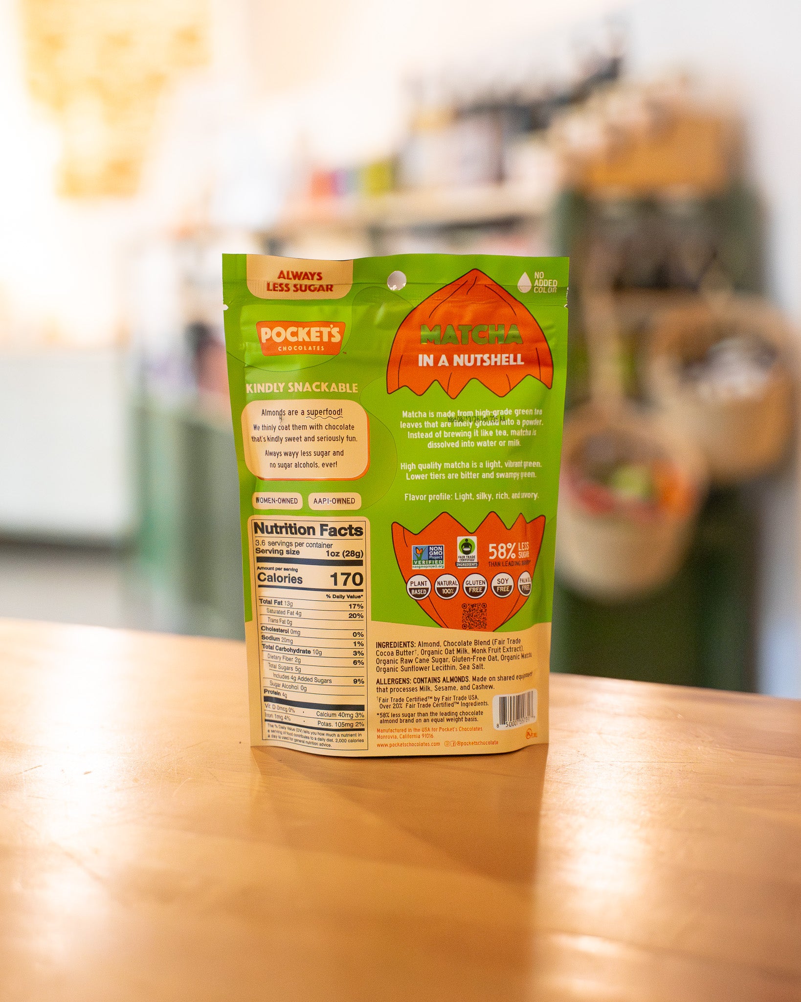 Indulge in Pocket's Chocolates Matcha Chocolate Almonds. Made with its signature Oat Milk Chocolate, these low-sugar, premium snacks boast enticing flavors that reflect our Asian American roots. Satisfy your sweet tooth with confidence, knowing you're enjoying quality ingredients.