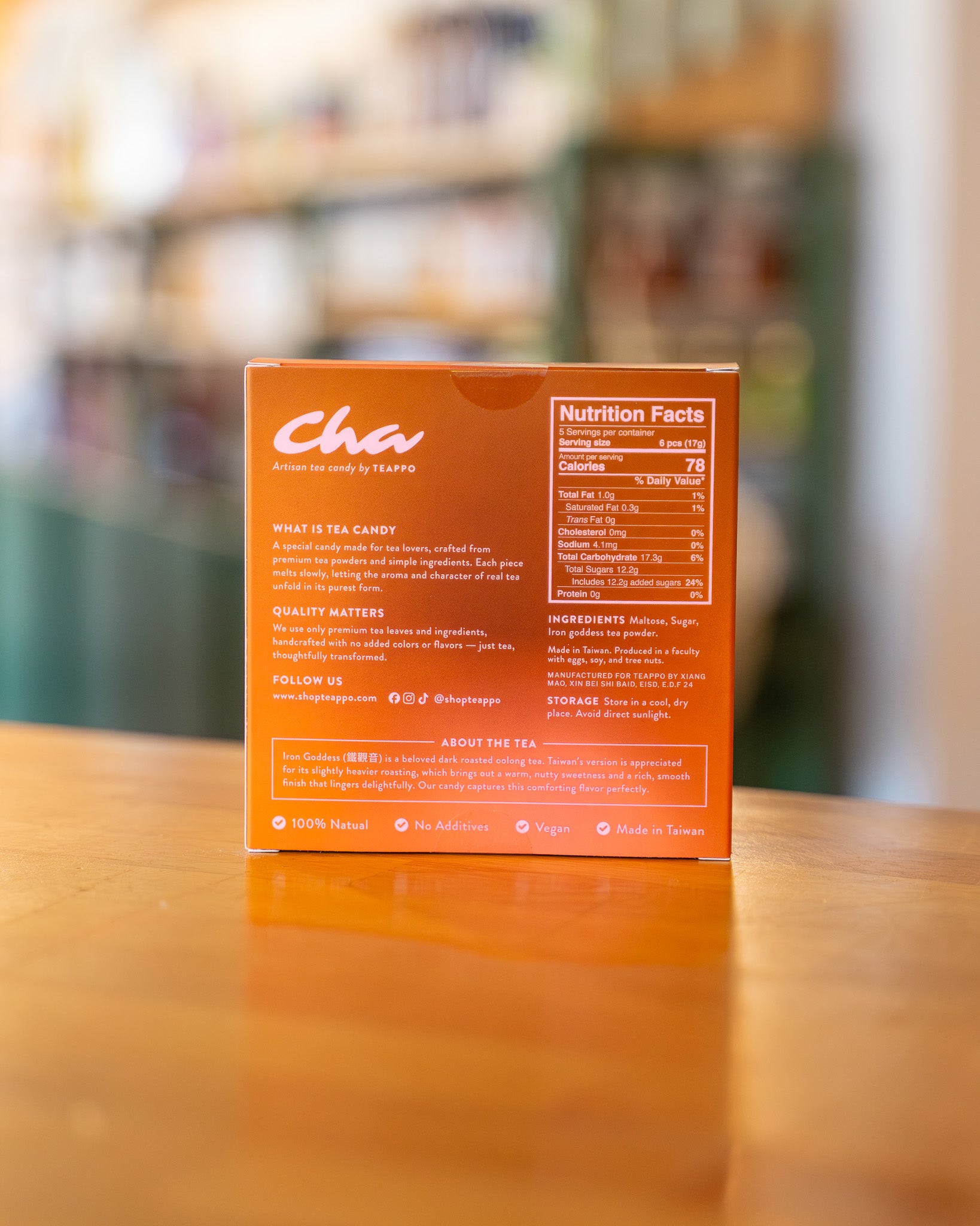 Iron Goddess (鐵觀音) is a beloved dark roasted oolong tea. Taiwan’s version is appreciated for its slightly heavier roasting, which brings out a warm, nutty sweetness and a rich, smooth finish that lingers delightfully. Teappo candy captures this comforting flavor perfectly. What is tea candy? A special candy made for tea lovers, crafted from premium tea powders and simple ingredients. Each piece melts slowly, letting the aroma and character of real tea unfold in its purest form.